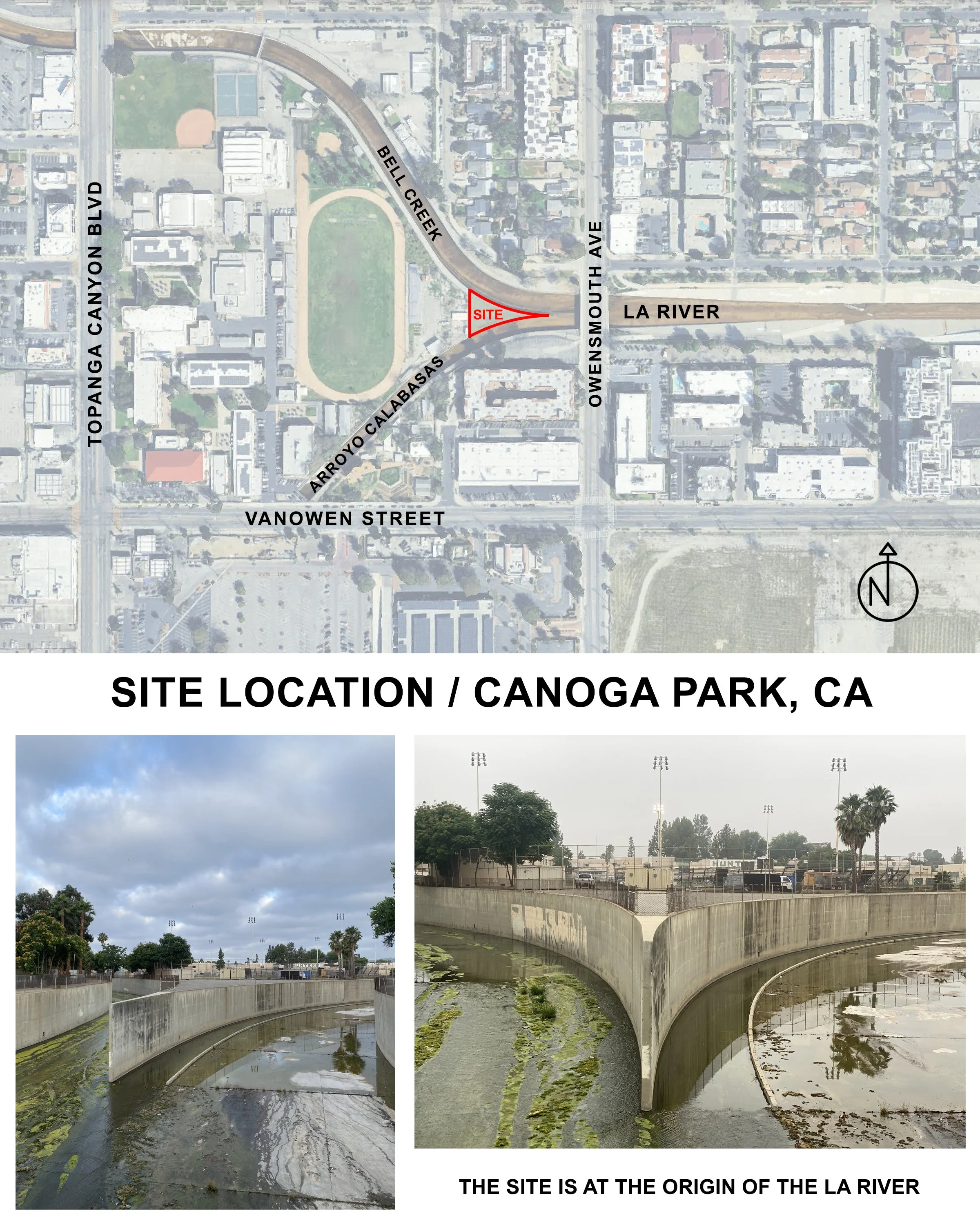A triangular concrete slab in the San Fernando Valley, located at the confluence of Arroyo Calabasas and Bell Creek—the headwaters of the Los Angeles River.