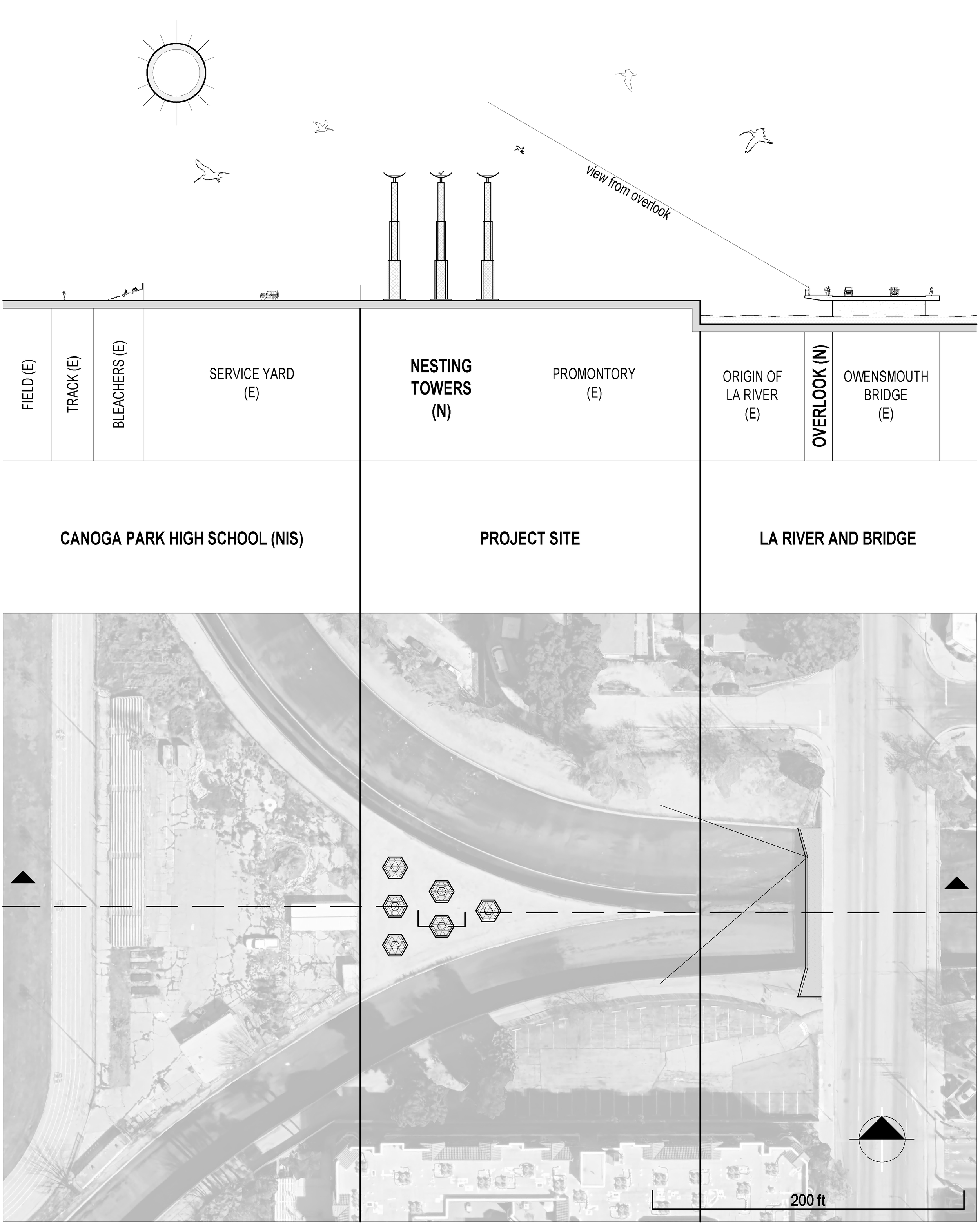 Overlook: A birdwatching platform integrated into the Owensmouth Avenue Bridge, connecting the public to restored habitat.